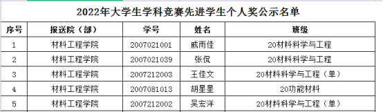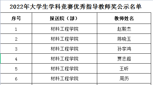 为表彰在上一年度学科竞赛组织、指导、参赛等方面表现突出的单位与个人,学校组织了2022年大学生学科竞赛评优工作。在各院(部)申报基础上,经评审,本次材料工程学院优秀指导教师奖6项,先进学生个人奖5项,现予以公示(见下表)。
