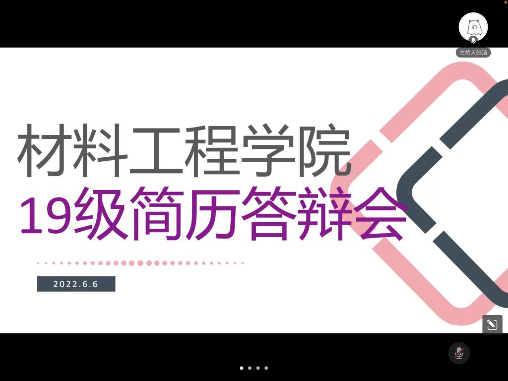 为培养我院学子专业素养,提高职场实践技能,展现青春风貌和进取态度, 6月6日晚,材料工程学院举办以“简青春风采,历职场未来”为主题的19级简历大赛线上答辩会。材料工程学院党委副书记陈智慧、材料科学与工程系主任林青、功能材料系主任张小娟、复合材料与工程系副主任庞娟、珠宝系蔡逸涛老师,19级各班班主任出席活动,材料工程学院学生代表参加。