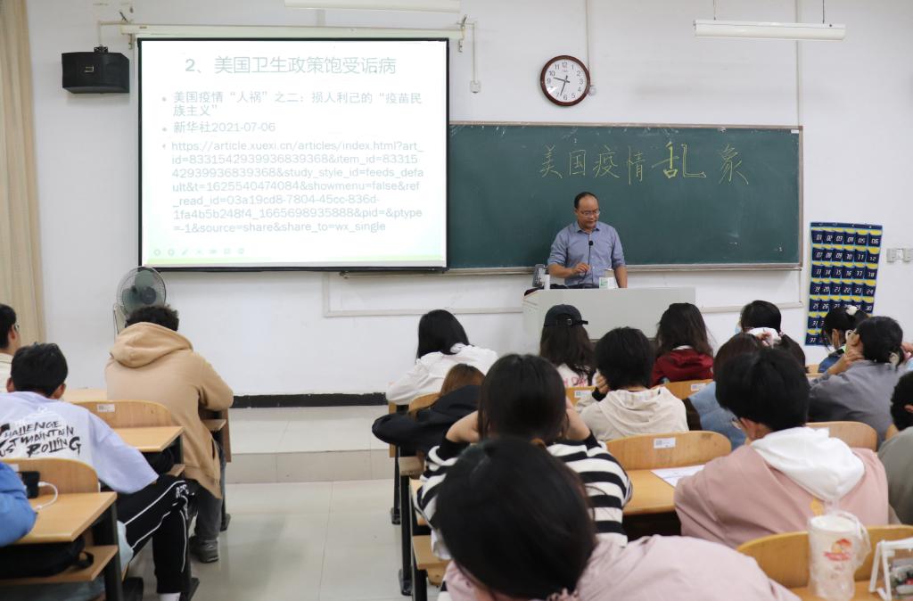 卢老师通过展示一组美国疫情数据引出讲座主题,总人口数仅有3.3亿的美国,累计确诊接近三分之一的人口感染了新冠病毒。美国人在对新冠疫苗接种情况上也不诚实,声称自己接种了疫苗,但实际并未进行接种。美国政客在面对民众生命与经济数据的选择时,纷纷选择了后者,由此揭露了美国卫生政策饱受诟病的原因。与此形成对比的是,中国广大人民群众团结一心,坚信党和国家基于疫情形势做出的正确判断和决策,同心同力抗疫。