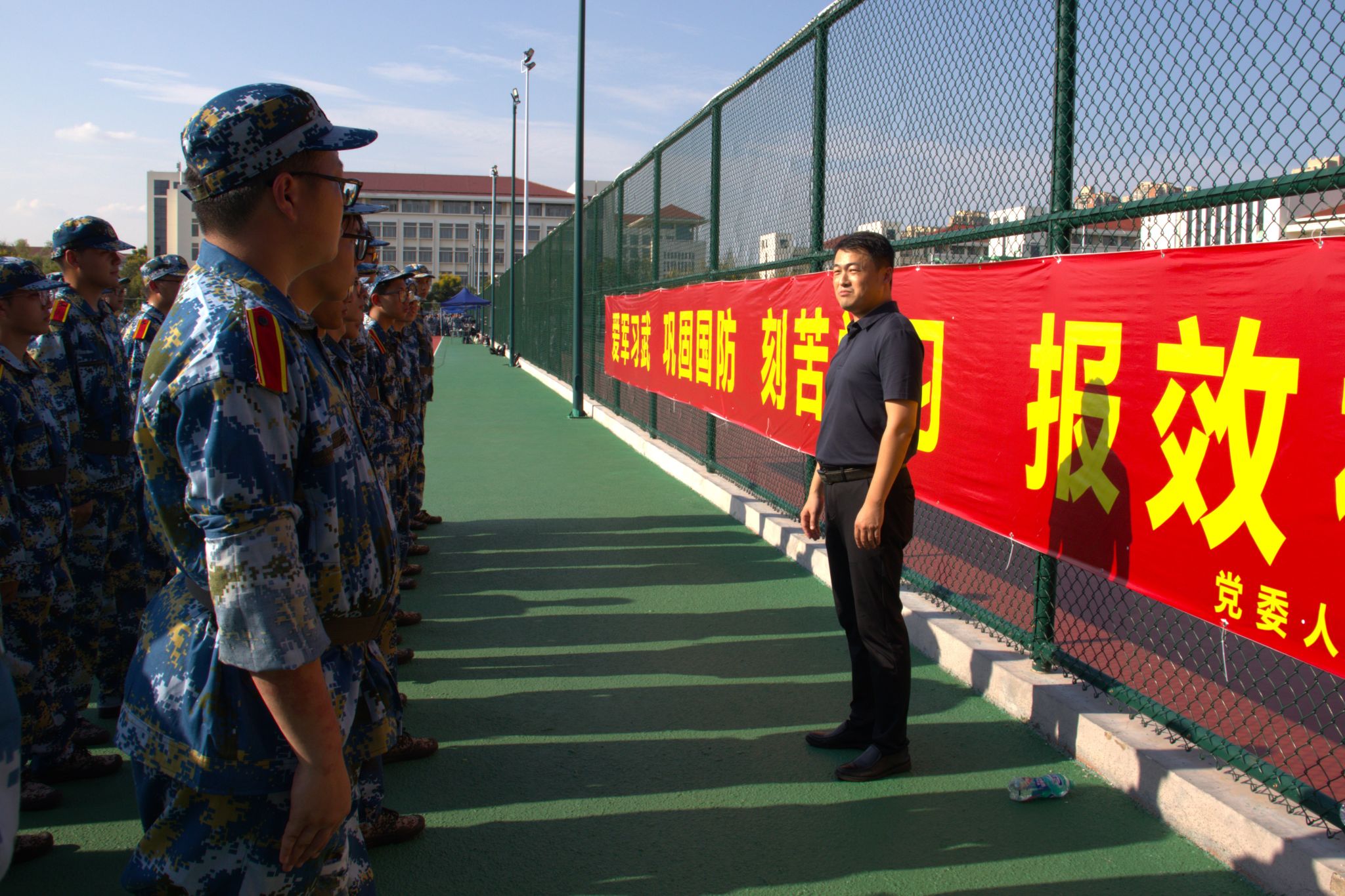 迷彩戎装,英姿飒爽。为进一步了解学院2023级新生的军训开展情况,鼓舞新生军训的士气,9月18日下午,材料工程学院党委书记叶原丰、院长郝凌云、党委副书记陈智慧在新生辅导员赵志伟的陪同下来到军训场地,对参加军训的新生们进行慰问。