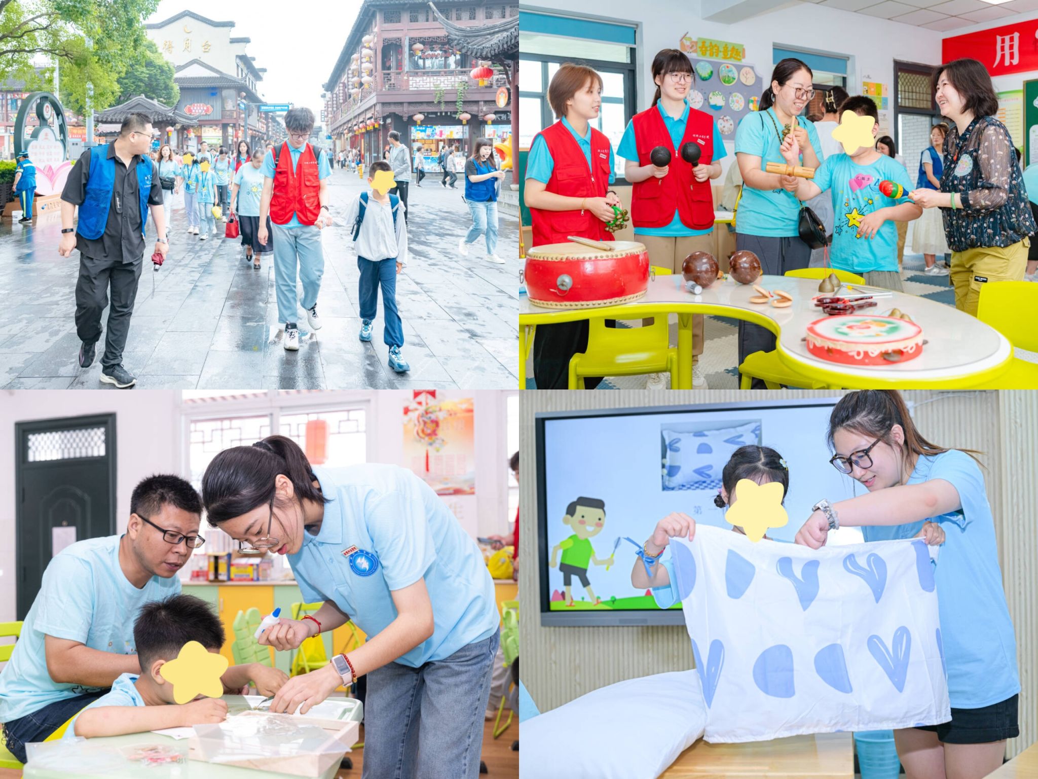 仪式结束后,志愿者们分为两组深入班级,与班主任一起带领小营员们开展丰富多样的活动。本次夏令营按照孤独症孩子年龄特点分为“小星星成长营”和“星耀少年成长营”。在“小星星成长营”中,志愿者陪同即将成为小学生的小星星们探寻花草书签之美、体验户外团康小游戏、感受亲子地板疗愈时光等。在“星耀少年成长营”中,志愿者纷纷融入到小朋友们中间,耐心细致地引导他们制作清凉水果茶、研学游览中国科举博物馆、体验非遗漂漆扇等,让孩子们感受到了来自大哥哥、大姐姐的关爱和温暖。