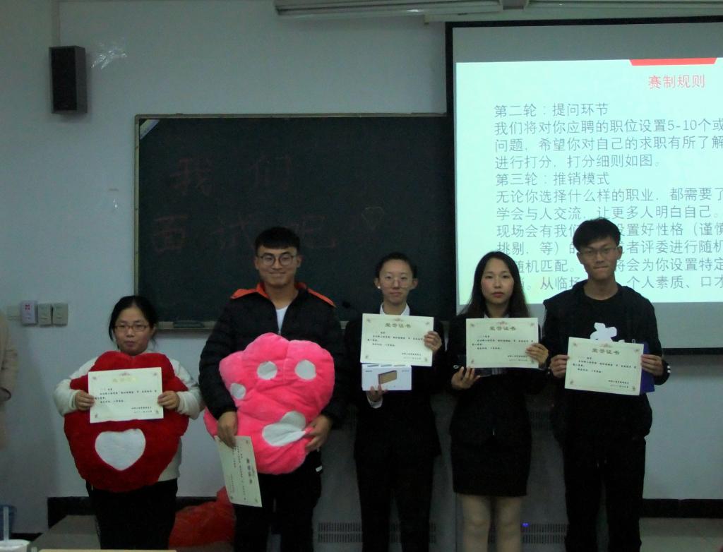 活动伊始,各位选手通过简短的自我介绍向面试官展示自己,随后,选手通过抽签选定面试题目,经简短准备后,现场模拟面试环节,评委们针对选手的回答,提出了中肯的建议。最后,面试者进行情景再现,就自己的工作进行进一步的现场演练,现场气氛十分热烈。经激励比拼,王旖获得第一名,叶紫晴和徐乐乐获得第二名,熊威和张菁获得第三名。
