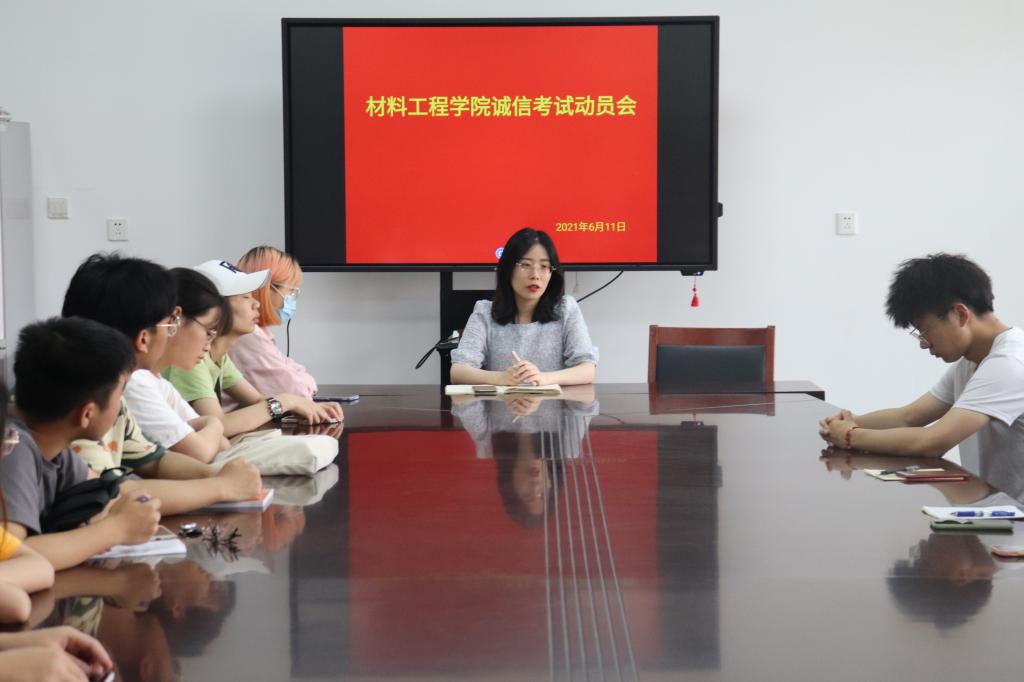 随着“考试月”的到来,为向我院学生强调做人诚信、诚信考试的重要性,激励同学认真复习,材料工程学院于6月11日中午在工科楼会议室召开诚信考试动员会,会议由辅导员王亚男主持,各班班长、学习委员、学生代表参加。