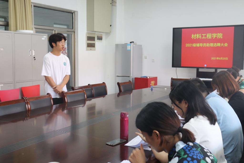 为顺利选拔2021级新生班辅导员助理,并对参选同学进行思想审核,考察竞选者的语言组织、临场发挥、情况处置能力,材料工程学院于6月25日中午在学院会议室举办2021级新生班辅导员助理选拔。材料工程学院党委副书记陈智慧、全体辅导员、18级辅导员助理担任评委,竞选候选人参加。