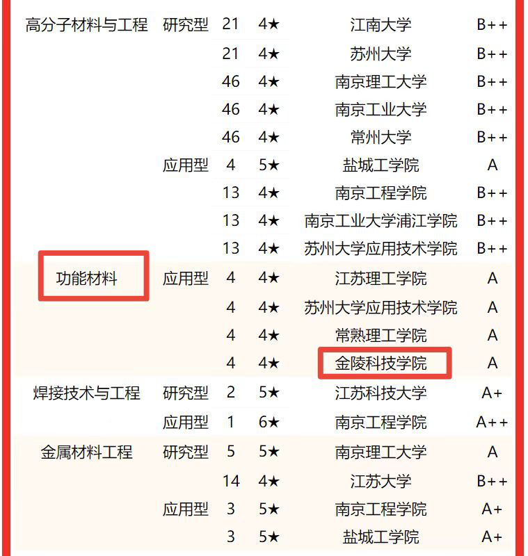 金陵科技学院复合材料与工程专业于2011年面向全国招收公办全日制本科生;经过十年的建设,于2021年获批江苏省一流本科专业建设点;2022年校友会江苏省大学一流专业排名中,排名五星级(5★)、A++专业,在应用型专业类别中全国排名第一。