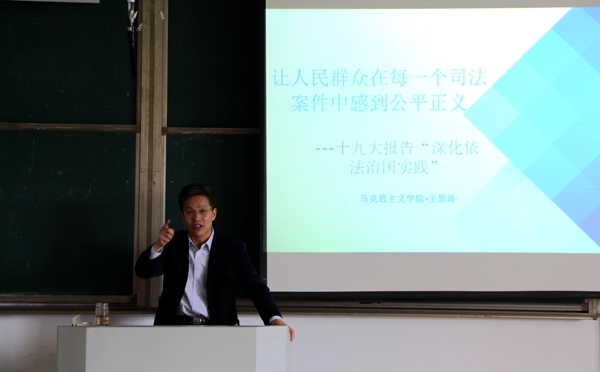 王教授从新时代中国特色社会主义的深刻变革、伟大实践、理论指导、基本方略、战略安排、行动纲领、坚强领导等七个重要方面,为同学们深度剖析了十九大的核心理念及主要价值。在讲座中,王教授从“新时代”的内涵把握讲起,从社会主要矛盾发生的转化为突破,系统阐述了十九大报告中“人民日益增长的美好生活需要和不平衡不充分的发展之间的矛盾”的论断。