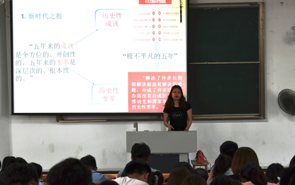 讲座伊始,董老师播放了“习近平为你描绘新时代”视频,可视化地解读习近平总书记十九大报告,展现中国共产党带领中国人民实现中华民族伟大复兴梦想的不懈努力与辉煌成就。随后,董老师分别从以下五个方面为大家讲解了党的十九大精神:1、新时代:中国特色社会主义新的历史方位2、新使命:中国共产党的历史使命3、新思想:习近平新时代中国特色社会主义思想4、新战略:中国特色社会主义发展战略的新谋划5、新部署:中国特色社会主义的新部署。